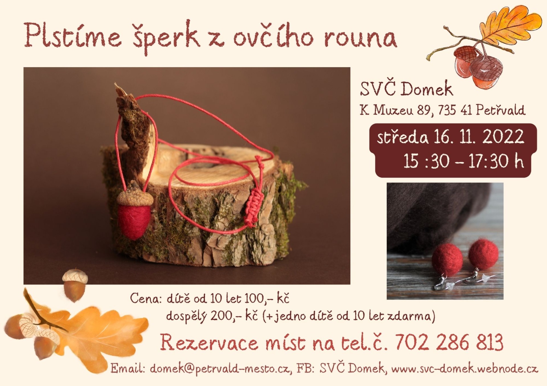 Dvouhodinový workshop suchého plstění ovčího rouna vhodný pro dospělé a děti od 10 let. Zhotovíme si přívěsek na krk ve tvaru žaludu, naučíme se uvazovat na voskované šňůře posunovací uzel a kdo bude už hotový, může si k přívěsku přidělat náušnice. Veškerý materiál a pomůcky budou na místě k dispozici.