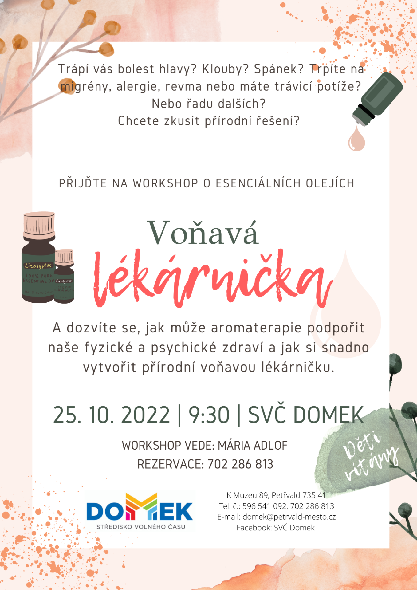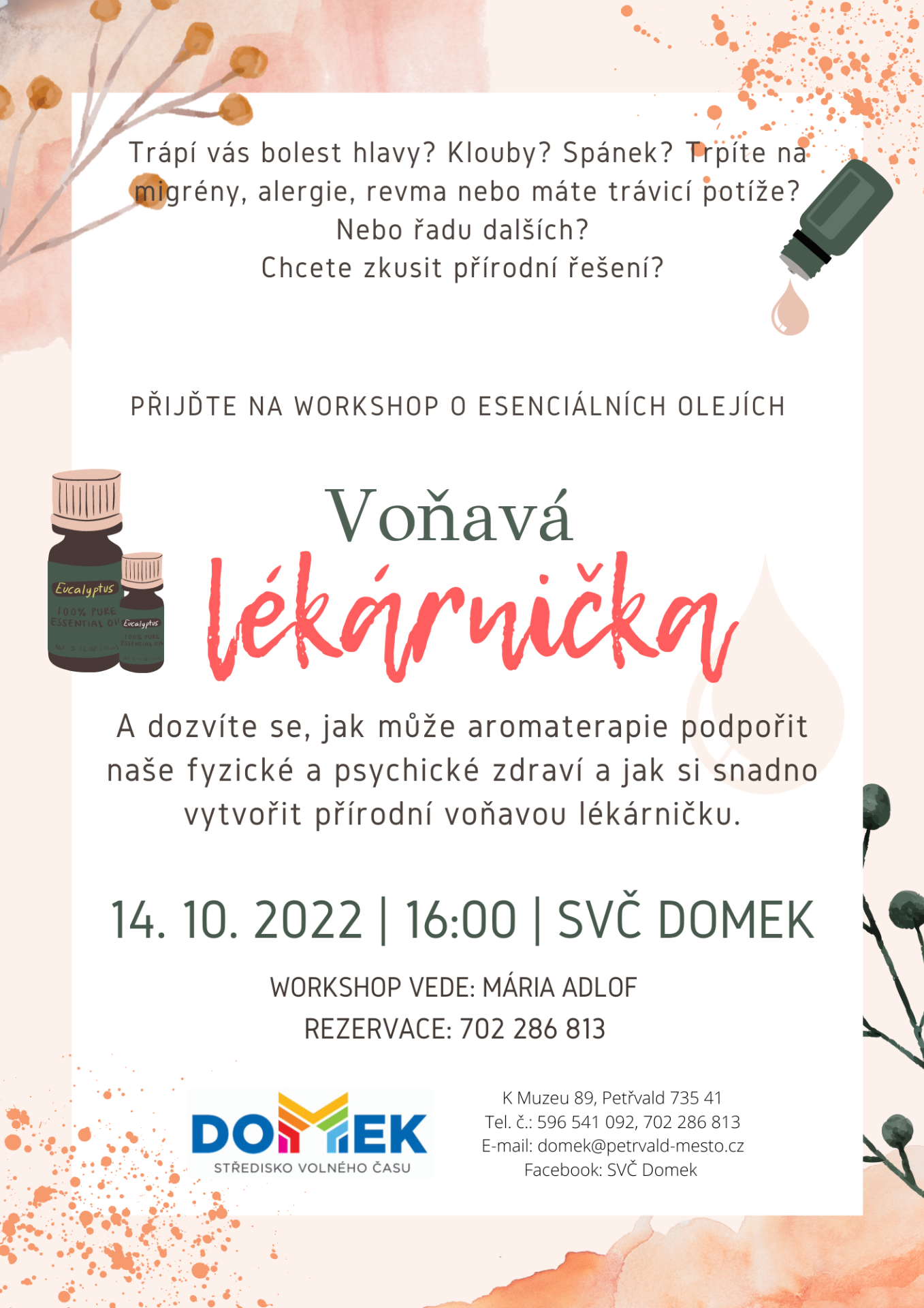 Esenciální oleje a jejich vliv na fyzické a psychické zdraví nás a našich dětí. Jak si ulevit od bolesti, a dalších běžných zdravotních potíží přírodní cestou. Možnost vyrobit si směs esenciálních olejů dle svých potřeb. V úterý 25.10. od 9:30, cca 90 min.