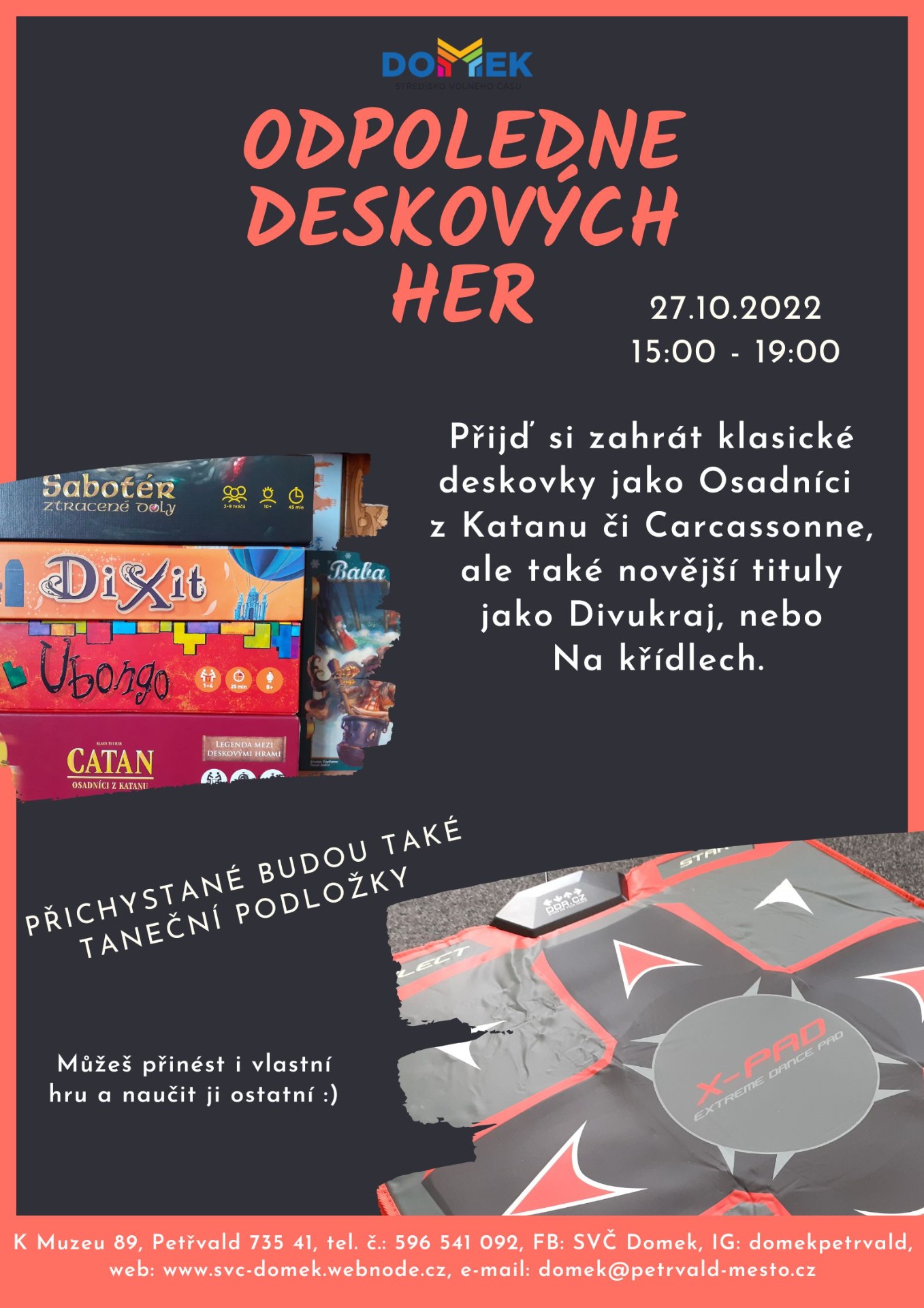 Ve čtvrtek odpoledne 27.10. si můžete na Domku zahrát některou z oblíbených moderních deskových her. Zároveň bude k dispozici hra na tanečních podložkách X - PAD při které rozhýbete celé tělo a zároveň vyzkoušíte vlastní smysl pro rytmus.